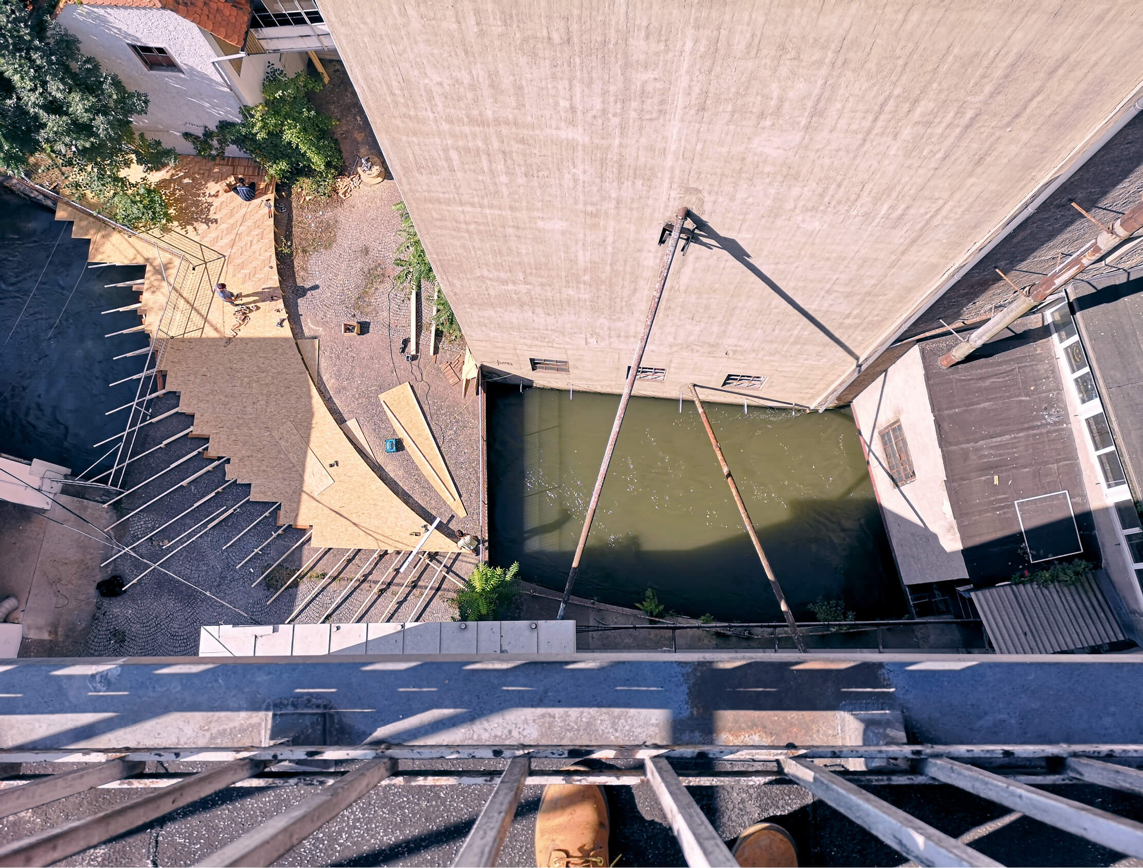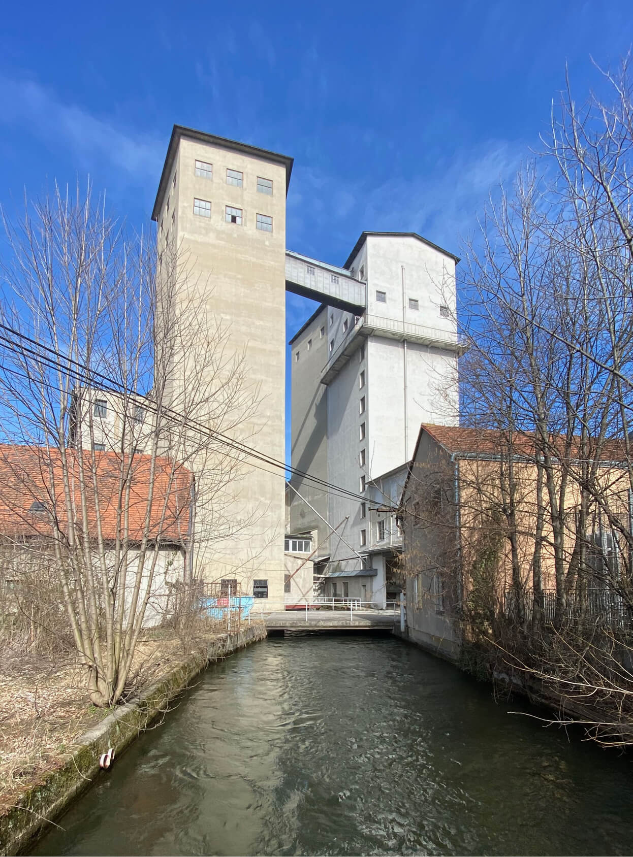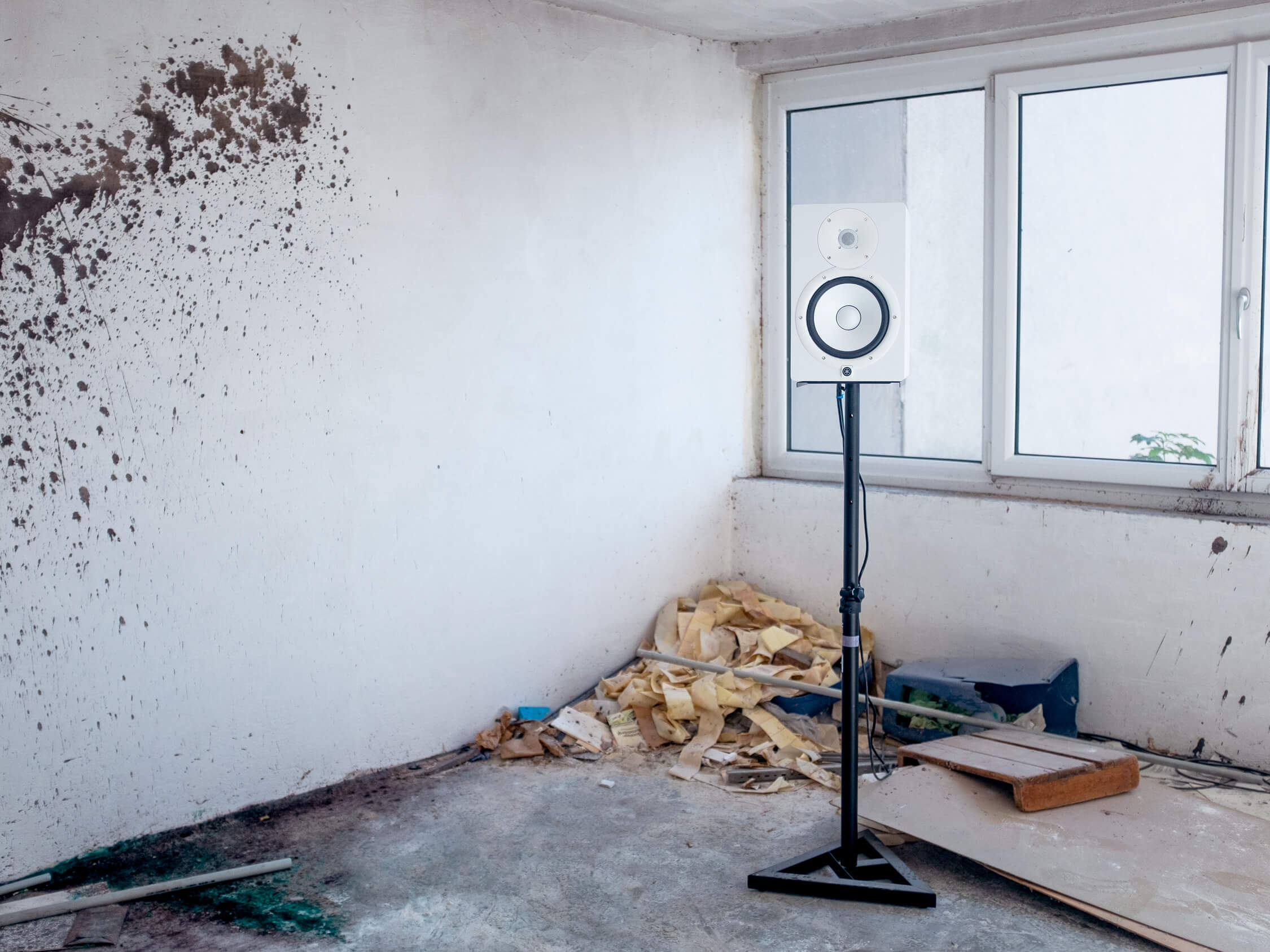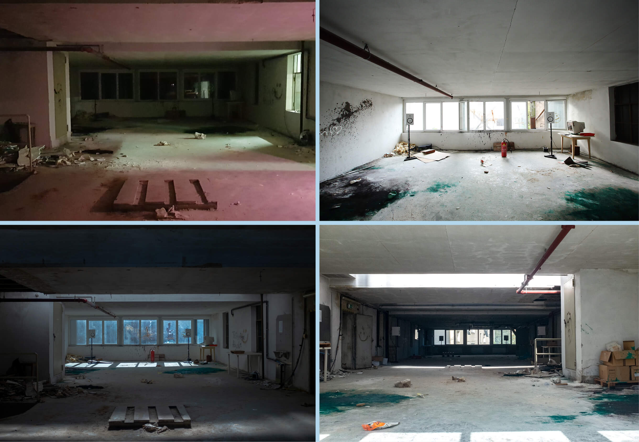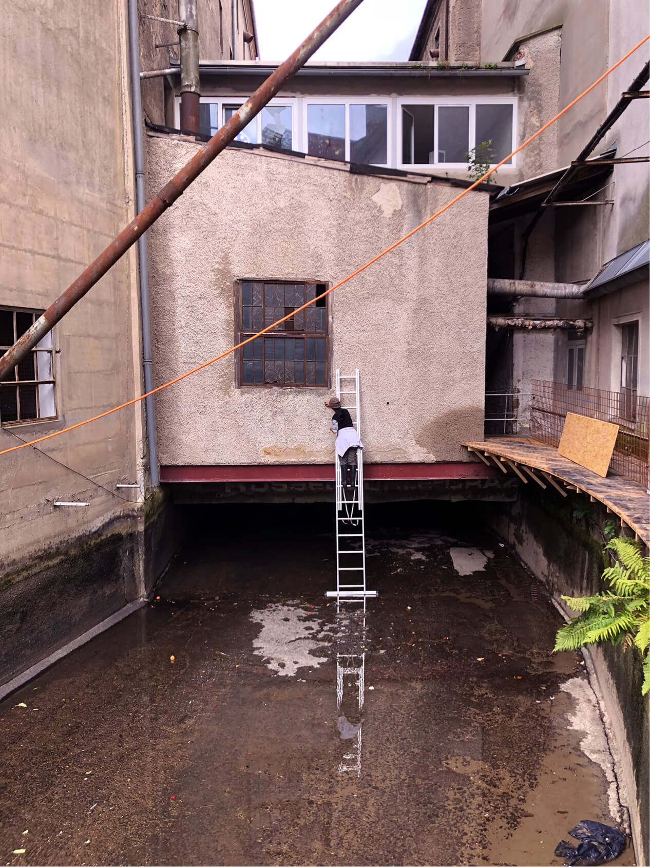 exhibition in a decommissioned flour mill in Graz (Rösselmühle, built in 1270 for a priest to run). The room where my piece was installed connects two grain towers and functioned like the body of an instrument, squeezing the sound out through the floors of the mill. I didn't clean the room up and liked the different layers of time that were visible. I wanted to score and pull them into focus. Narrativize them with electrical impulses. -----------The room I worked in was the last stop on tours of the mill. It was the former packing station and has ribbon windows on both ends that look out onto the Mühlgang canal. When the windows were open you could hear gates from a turbine drop into the water and collect power to sell to the city. For most of the show the electricity was from the turbine, but when the canal would run too quickly it would overwhelm it and shut off. I really liked the idea of sound only playing when the turbine ran. ----------------------I only experienced the sound from high in the building a few times, mostly I was obsessed with how it balled up in the room. When I went outside it was more saturated, the mix would glue together and get caught in the wind. It felt more like an image. In the low-ceilinged room the speakers were in, the sounds were more localized, more like objects and bodies. They seemed to come into direct contact with the architecture and each other. Push at the walls, hug each other. -----------------------------------For the audio, I was interested in how songs could become sculptures, how repetitive figures and chanting could oscillate between being meditative and menacing, spatial and cinematic. The songs I used were from an album I’d been working on (