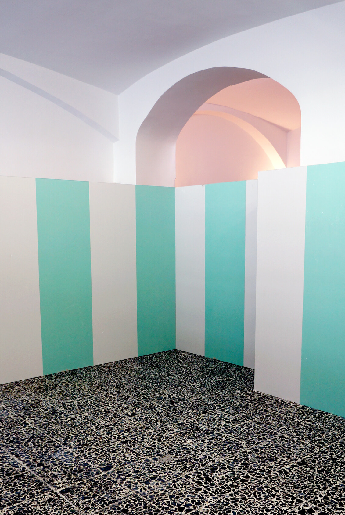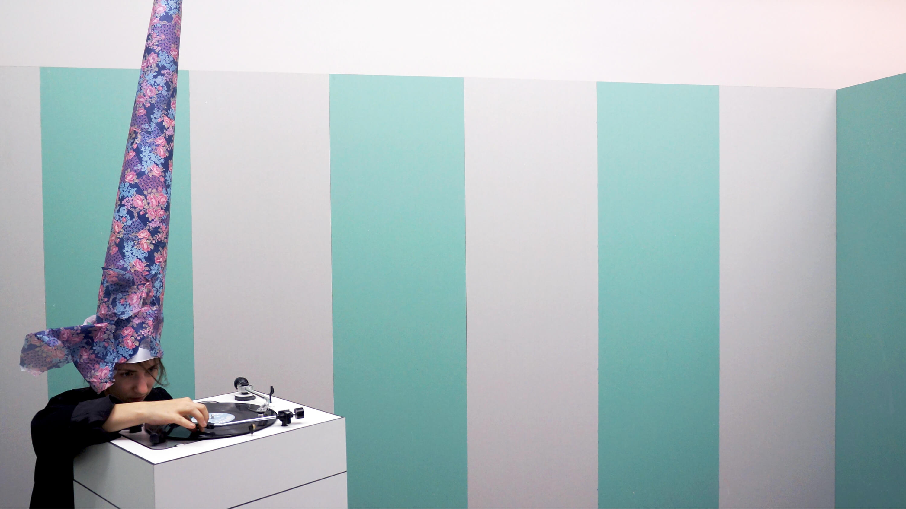 Along with the rotating collective Gruppe Uno Wien, a spatial performance was made that asked visitors to pass through a series of rituals in order to belong to a temporary community. Questioning the role built form plays in the creation of social formations, the geometry of the gallery was re-sequenced to underline how easily divisions can be made and the absurdity of their enforcement. ____First, the performance asked that you eat a risotto ice cream cone in the office of the gallery, pass through a station where wizard hats (Schultüte) were being made to order, then, if these rites of passage had been met, you could enter the interior of the gallery where a sculpture framed a triple-armed turntable that was open to any willing DJ. While these rituals provided a temporary sense of belonging, the space created a view onto those who'd already joined: through the glass door of the storefront, you could see the members of the party, their hats peeking above the top of the sculpture, which blocked access to entering it unless you passed through the stations. By the end of the opening, the fleeting condition of belonging was highlighted as bodies and boundaries dissolved into the haze of a fog machine.
